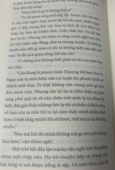 "Ta không ưa thay đổi. Cậu và ta không giống như nhà đại phủ thương Hassan kia. Lỡ mua một rạp thì ta cũng chẳng bận tâm gì. Nhưng nếu một trong hai chúng ta nhằm làm thì khó mà tồn tại."