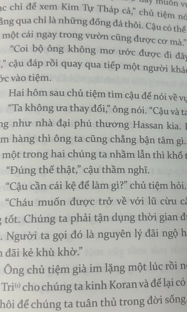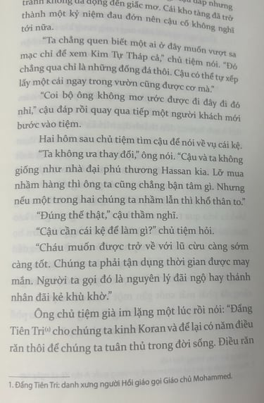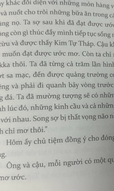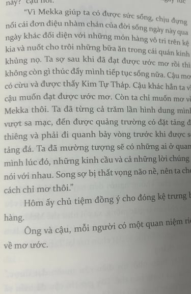 "Vì Mekka giúp ta có được sức sống, chịu đựng nổi cái đơn điệu nhàm chán của đời sống ngày này qua ngày khác đổi diện với những món hàng vô tri trên kệ và nuốt cho trôi những bữa ăn trong cái quán kinh doanh nọ. Ta sợ sau khi đã đạt được ước mơ rồi thì không còn gì thúc đẩy mình tiếp tục sống nữa. Cậu mơ có cừu và được thấy Kim Tự Tháp. Cậu khác hẳn ta vì cậu muốn đạt được ước mơ. Còn ta chỉ muốn mơ về Mekka thôi. Ta đã từng cả trăm lần hình dung mình vượt sa mạc, đến được quảng trường có đặt tảng đá thiêng và phải đi bằng lăng trước khi được sờ lên tảng đá. Ta đã mường tượng sẽ có những ai ở quanh mình lúc đó, những kinh cầu và cả những lời chúng ta nói với nhau. Song sợ bị thất vọng não nề, nên ta chọn cách chỉ mơ thôi."