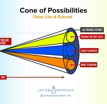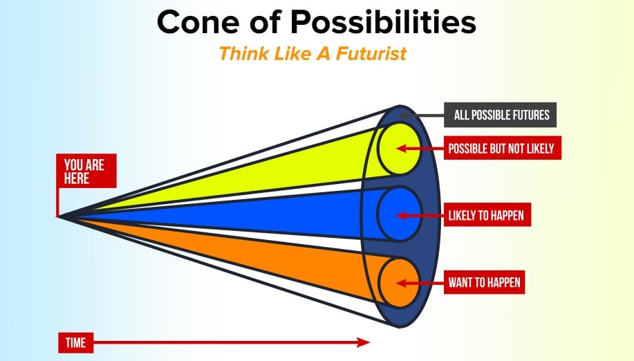 Các nhà tương lai học thường dùng mô hình "chiếc nón khả năng - the cone of possibilities" để giúp họ tư duy và hình dung các khả năng có thể xảy ra. Hãy tưởng tượng rằng bạn nhìn từ phần đỉnh của chiếc nón này. Nó tượng trưng cho thời gian, càng gần thì càng dễ đoán, nghĩa là số lượng kịch bản có thể xảy ra hay các khả năng cần xem xét cũng ít đi. Khi thời gian càng lâu, số lượng kịch bản và khả năng bạn cần xem xét càng tăng lên. Có nhiều loại khả năng bạn cần xem xét: